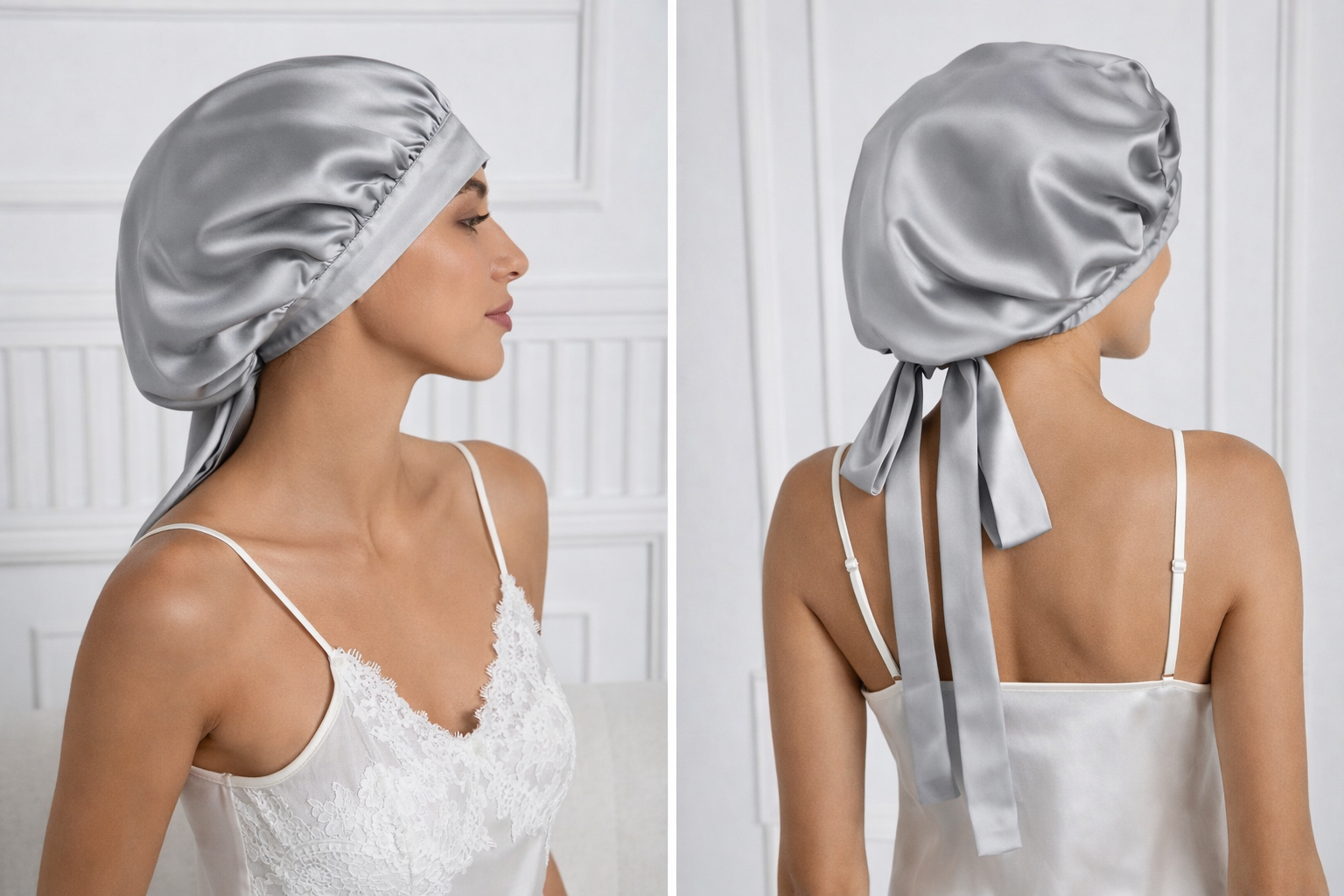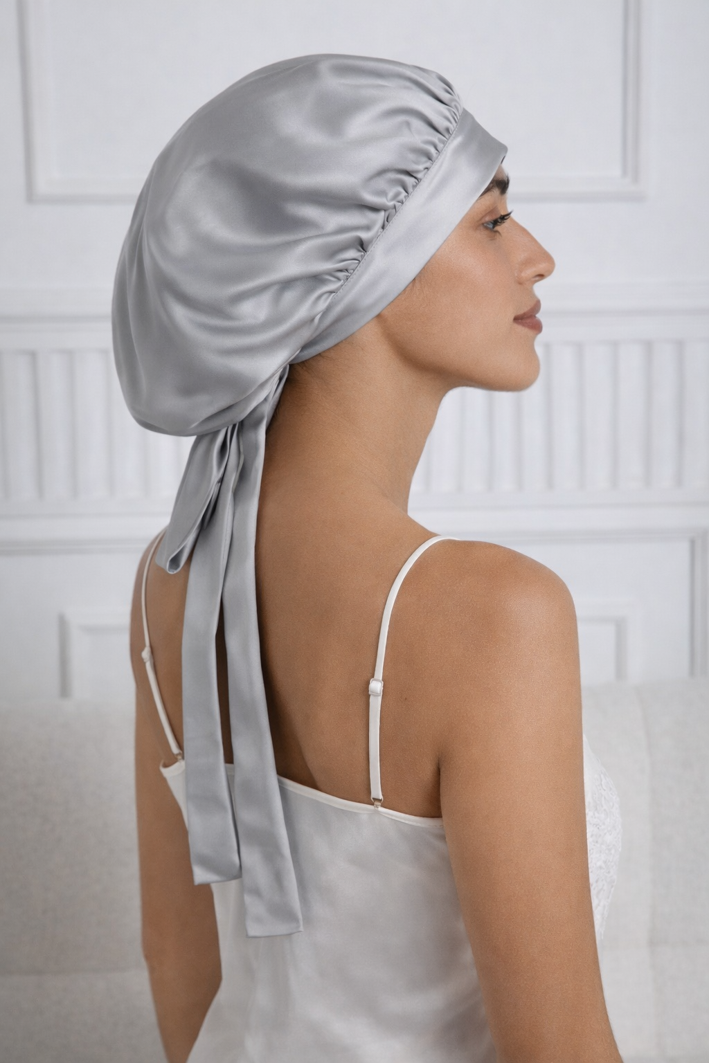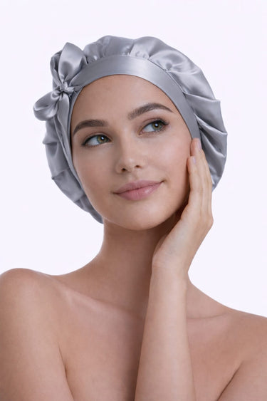 %100 Saf Ipek, Uzun Bağcıklı Lüks Gece Bakim Bonesi- Gümüş Gri