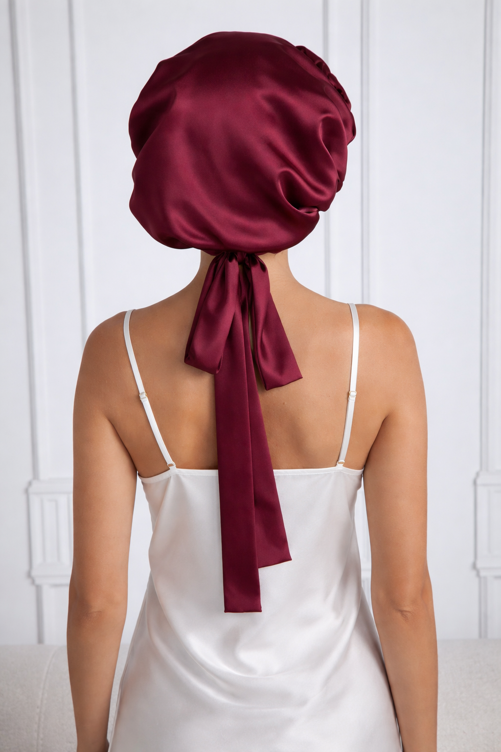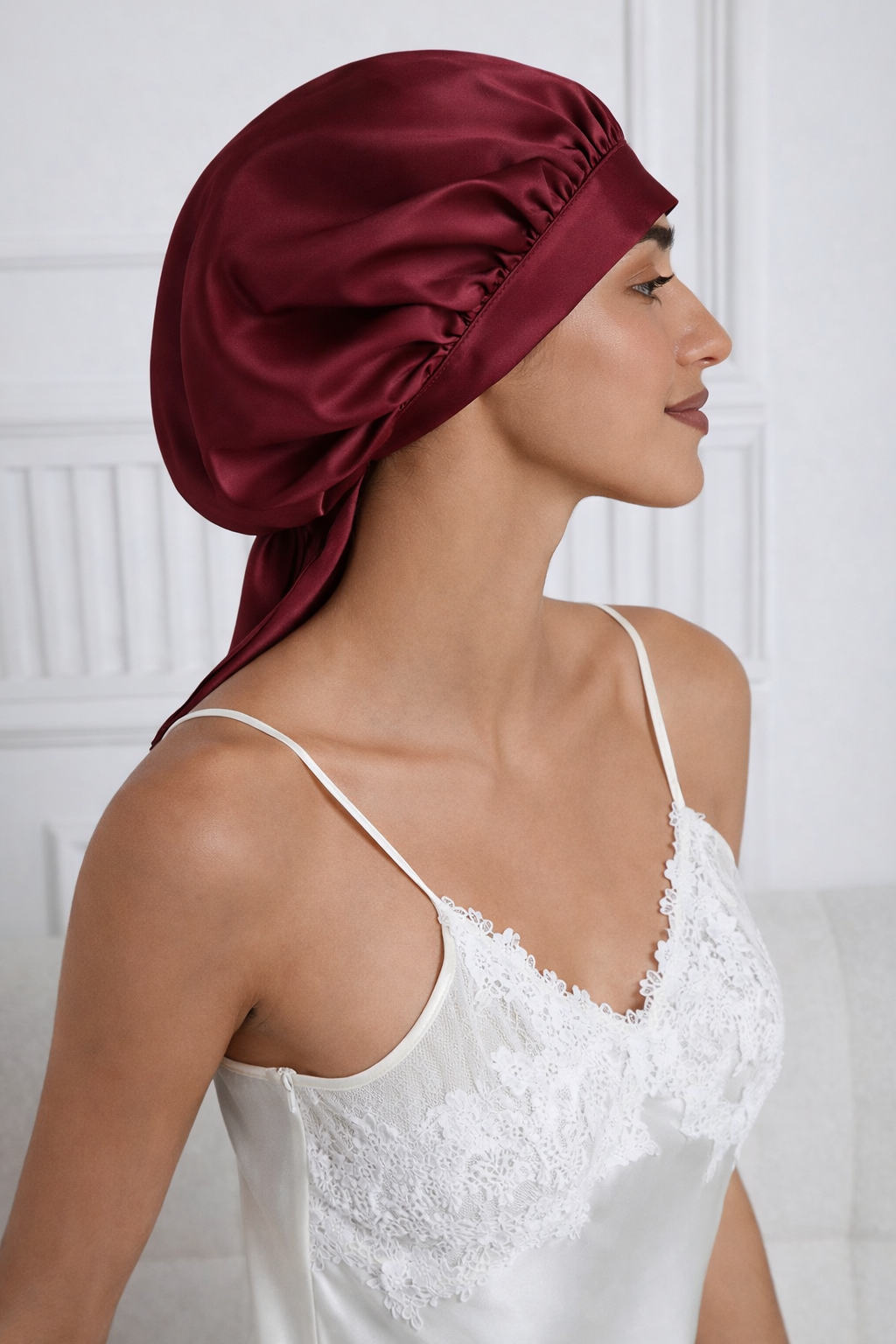 %100 Saf Ipek, Uzun Bağcıklı Lüks Gece Bakim Bonesi- Bordo
