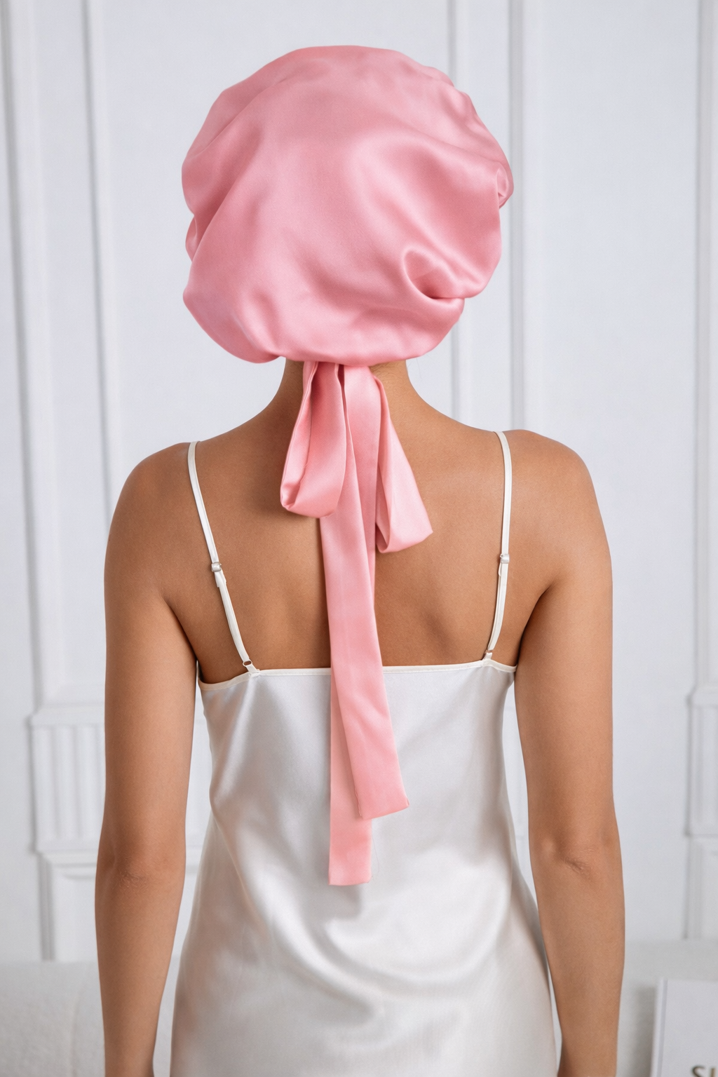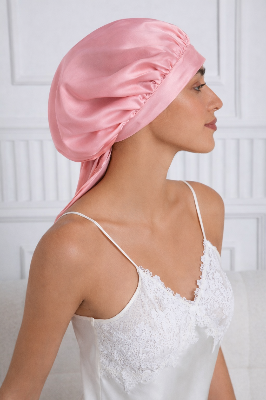 %100 Saf Ipek, Uzun Bağcıklı Lüks Gece Bakim Bonesi- Pembe